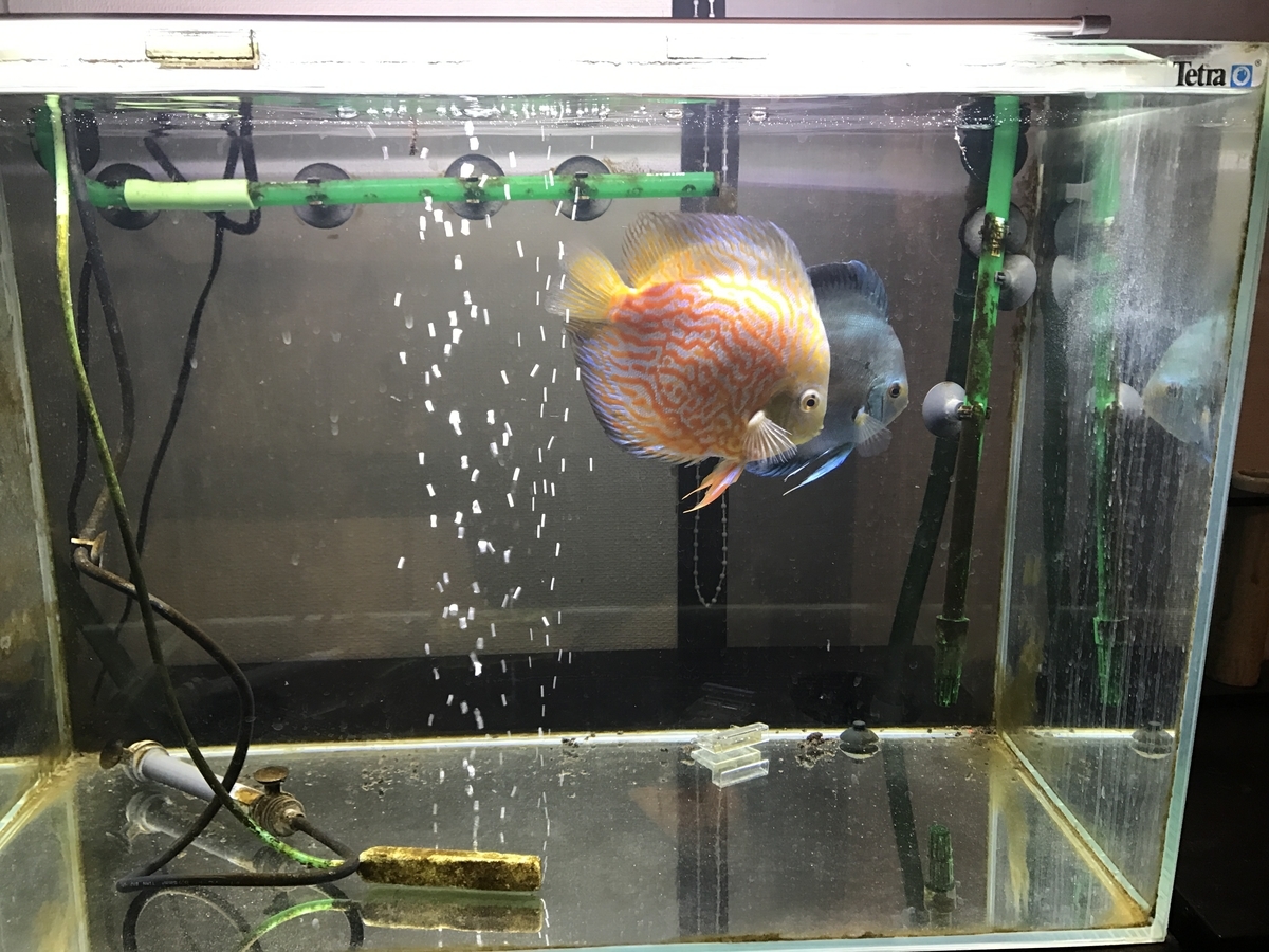 ここまで大きくするのは時間と水質管理の労力、良いエサが必須です。デイスカスはエサで水槽が汚れるので石とか、水草、オブジェクトは置きませんでした。